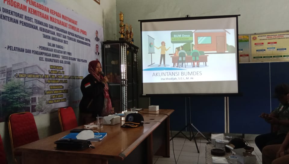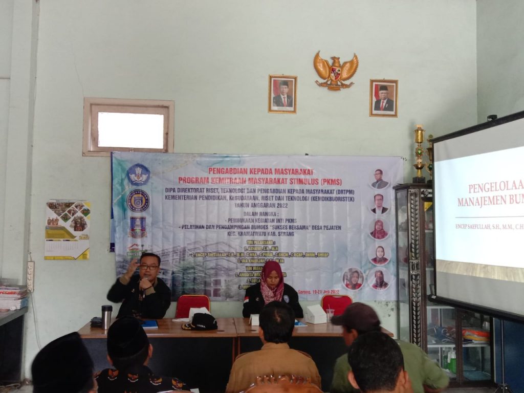Tim Program Kemitraan Masyarakat Stimulus (PKMS) UNIBA yang terdiri dari 3 (tiga) orang Dosen Tetap Universitas Bina Bangsa yaitu Asnawi, Encep Saefullah dan Ina Khodijah sebagai peraih dana hibah DIPA Direktorat Riset, Teknologi dan Pengabdian kepada Masyarakat (DRTPM) Kementerian Pendidikan, Kebudayaan, Riset dan Teknologi (Kemdikbudristek) RI Tahun Anggaran 2022 melaksanakan kegiatan Pelatihan dan Pendampingan kepada para pengelola BUMDes “Sukses Bersama” Desa Pejaten Kec. Kramatwatu Kab. Serang selama 3 (tiga) hari efektif, dimulai dari hari Selasa, 19 Juli 2022 sampai dengan Kamis, 21 Juli 2022 yang bertempat di Aula Kantor Desa Pejaten. Mitra dalam program ini adalah Pemerintah Desa Pejaten sebagai Mitra Kerjasama dan pengelola BUMDes “Sukses Bersama” sebagai Mitra Sasaran.