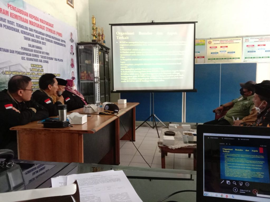 Senada, Ketua tim PKMS Asnawi juga menyampaikan bahwa bahwa PKMS ini merupakan bentuk nyata sinergitas antara Insan Akademik dengan Masyarakat, sebagai bagian dari implementasi Tridharma Perguruan Tinggi. Dengan harapan, memberikan dampak positif bagi masyarakat khusunya mitra sasaran dalam peningkatan pengetahuan, pemahaman dan keterampilannya dalam mengelola usahanya, sehingga dapat meningkatkan perekonomiannya. Kegiatan pelatihan dan pendampingan ini dibuka oleh Kepala Desa Pejaten H. Ahmad Rofe’i. Hadir dalam kesempatan ini selain Kepala Desa beserta perangkat Desa, pengelola BUMDes “Sukses Bersama”, BPD, Karang Taruna, dan para pelaku UMKM. Dalam sambutannya, Kepala Desa Pejaten mengucapkan banyak terima kasih kepada Universitas Bina Bangsa , khususnya tim PKMS yang sudah memberikan ilmu dan pengetahuannya untuk ditransfer ke masyarakat, sehingga masyarakat khususnya pengelola BUMDes “Sukses Bersama”, para pelaku UMKM lebih meningkat pengetahuannya, lebih terampil dalam mengelola usahanya