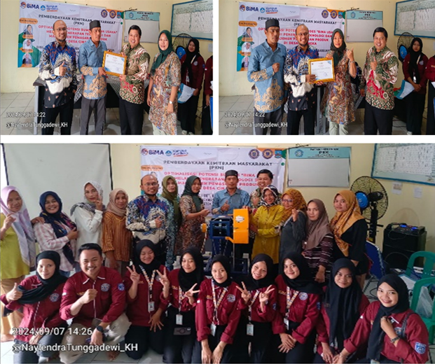 Kegiatan PKM dana dipa direktorat riset, teknologi dan pengabdian kepada masyarakat (DRTPM) kemendikbudristek RI Tahun Anggaran 2024 dilaksanakan dari bulan Juli hingga akhir Desember 2024, dimana capaian yang dicapai adalah peningkatan 80% peningkatan pengetahuan dan pemahaman mitra “Bina Usaha” dalam optimalisasi manajemen pengelolaan BUMDes terhadap pemberdayaan ekonomi masyarakat. Selain itu juga diharapkan mitra “Bina Usaha” mendapatkan peningkatan 75% penerapan IPTEK yang di sampaikan oleh tim PKM. Selain itu mitra dapat lebih meningkatkan manajemen usaha dan juga volume pemasaran menjadi lebih maksimal dengan adanya bantuan teknologi tepat guna yaitu mesin pemipih melinjo. Diharapkan pada masa mendatang akan ada workshop atau pelatihan lanjutan untuk pengembangan BUMDes “Bina Usaha” agar lebih maksimal dalam pengembangan potensi BUMDes di Desa Cinangka. #Red. ESC